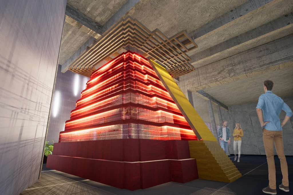 Por fuera podría ser una fantasía de colores guatemaltecos en la gama de los rojos y amarillos recuperando lo que los arqueólogos teorizan eran la policromía original de estas construcciones y por dentro le damos la vuelta como un calcetín al volumen y se convierte en un espacio vertical de colores azules y verdes (como la selva donde se encuentra el original, incluso con música compuesta ad-hoc para recrear Guatemala) donde exhibimos las piezas de los diseñadores guatemaltecos.